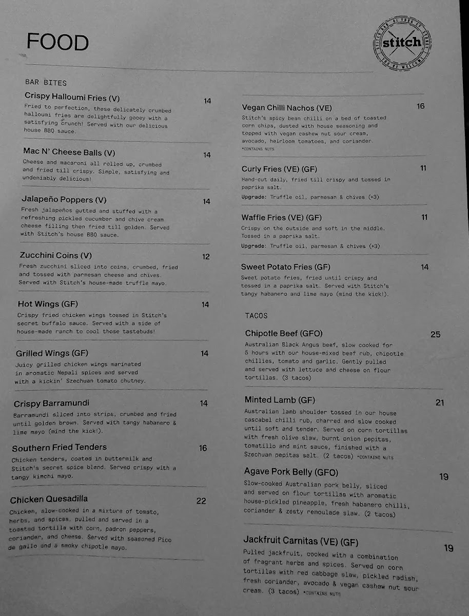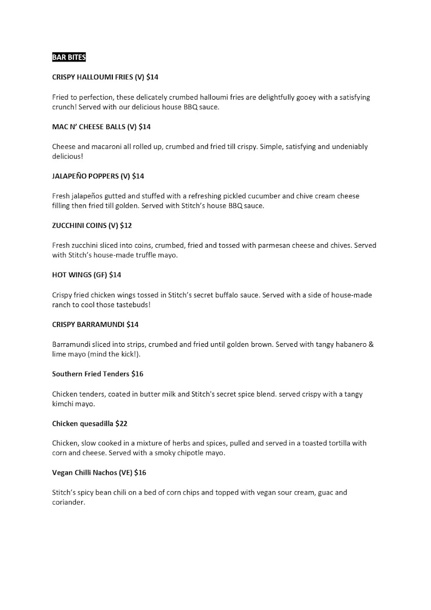 Stitch Bar Menu