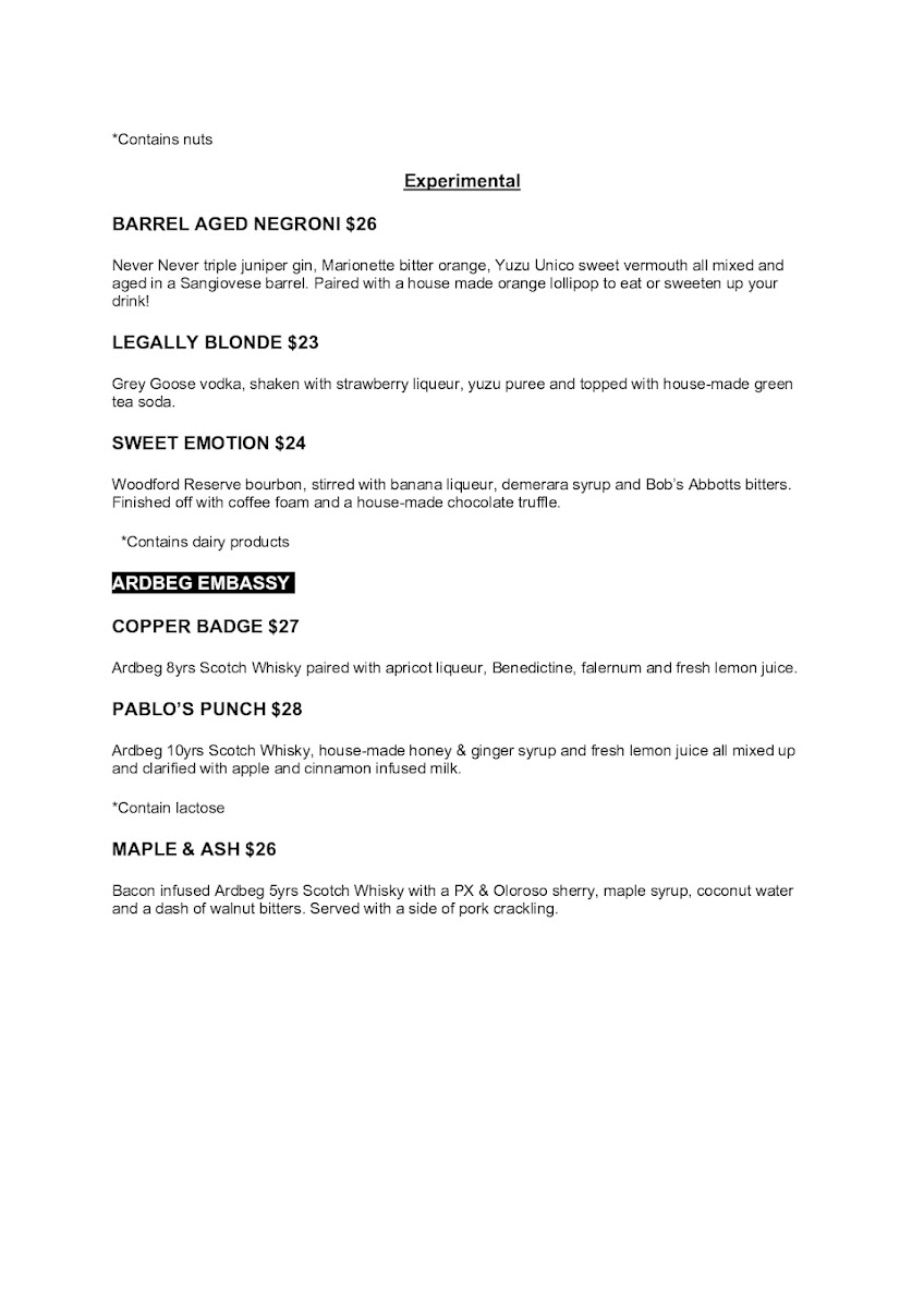 Ardbeg 10yrs, honey & ginger syrup, lemon juice. All filtered and clarified through apple & cinnamon milk. *Contain lactose!