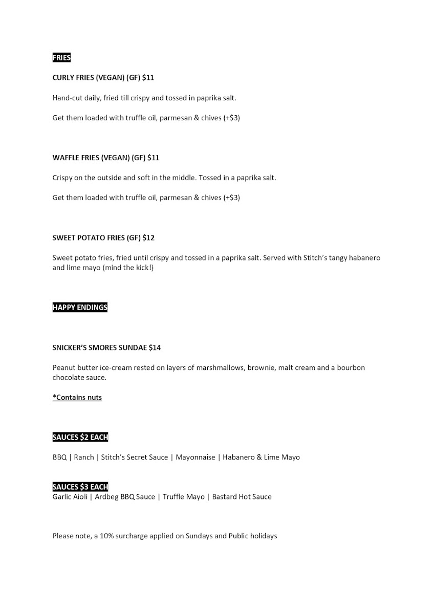 A hefty 160g Australian Angus beef patty, flame grilled to perfection. Served between a milk bun with cheese, American mustard, caramelised onion and Stitch’s secret house sauce (mind the kick!)